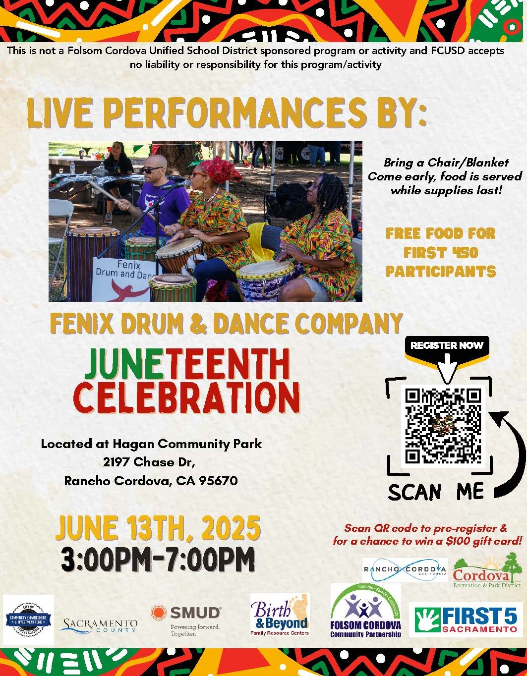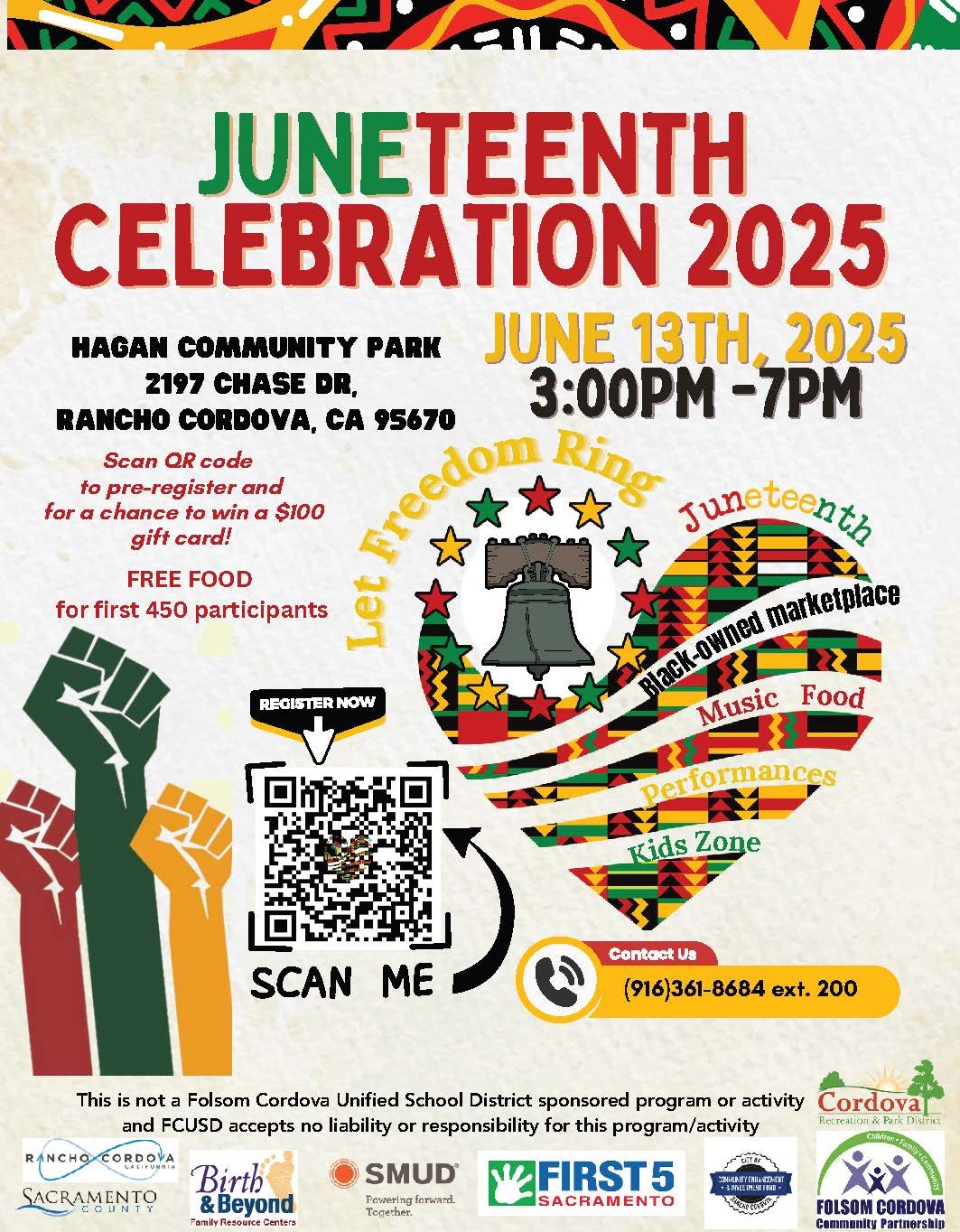 Join us at Hagan Community Park in Rancho Cordova for our annual Juneteenth Celebration, a pivotal event that celebrates the end of slavery and uplifts the continued struggle for Black freedom, dignity, and equality. On June 19, 1865—over two years after the Emancipation Proclamation—enslaved African Americans in Galveston, Texas were finally informed of their freedom. Juneteenth stands as a powerful reminder of our nation’s history and the urgent need to advance racial justice today.