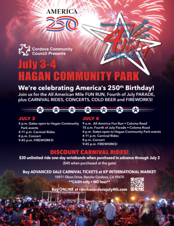 Rancho Cordova Fourth of July is a two-day festival and parade celebrating the local community and our American heritage. It is the signature event for the community. We’re celebrating America’s Semiquincentennial this year – we’re 250 years young!